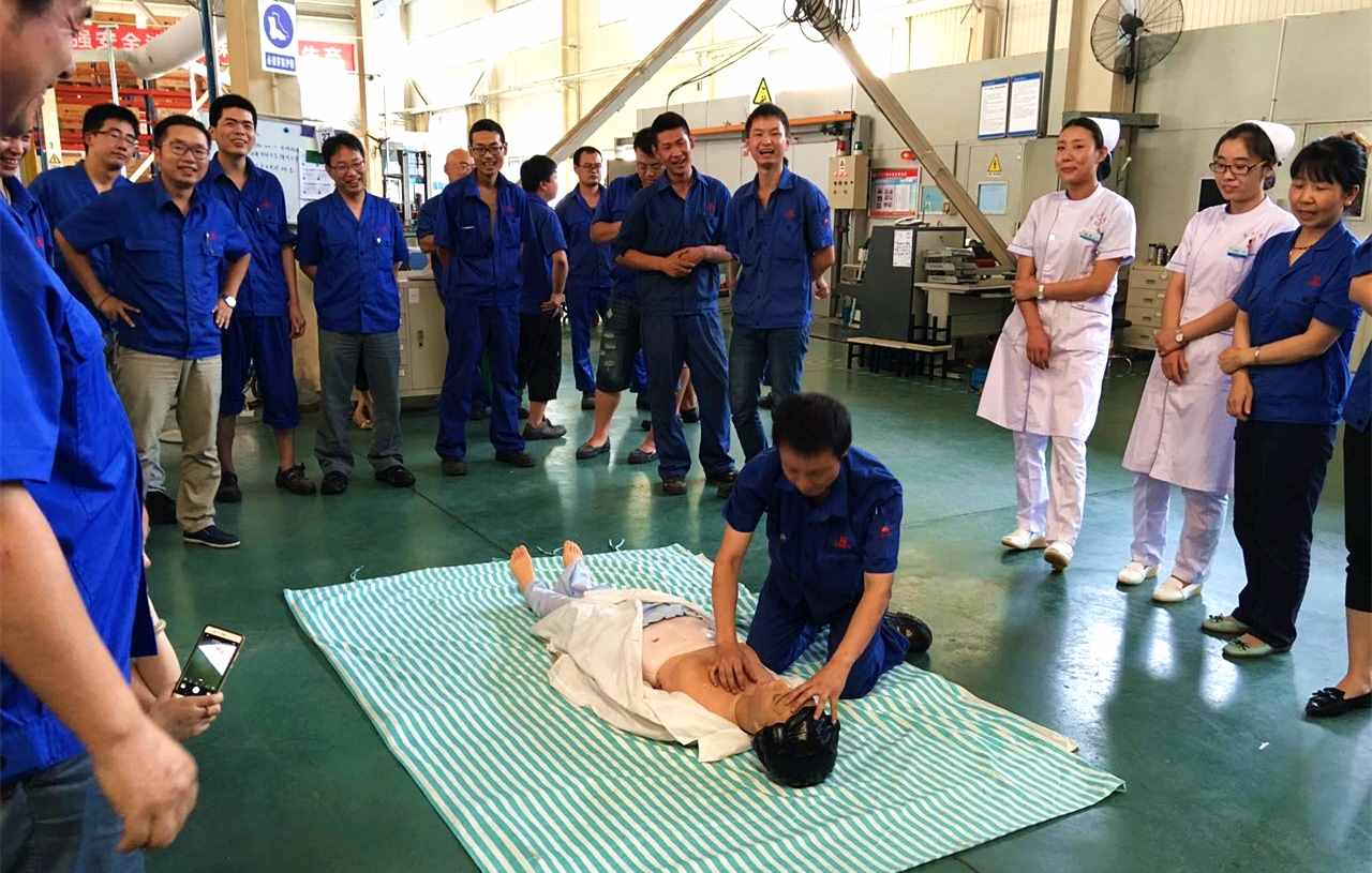 隨后,分別由2名護士在生產(chǎn)現(xiàn)場為職工進行了徒手“心肺復(fù)蘇術(shù)”演練的規(guī)范操作,趙副院長講解了操作要點及注意事項,現(xiàn)場職工積極參與,并親身體驗了“現(xiàn)場救人”演練操作。